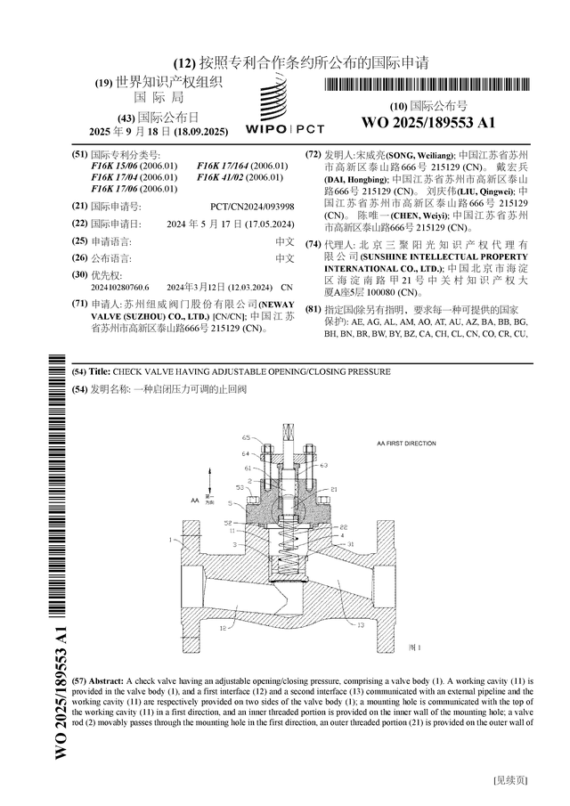 BB贝博登录入口:纽威股份发布世界专利申请:“一种启闭压力可调的止回阀”